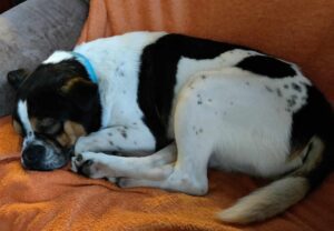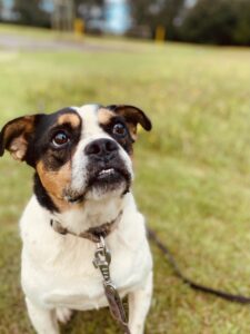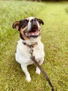 He came to the shelter with a broken chain around his neck. And we all know what that means: he was kept chained outside, tied to a doghouse.