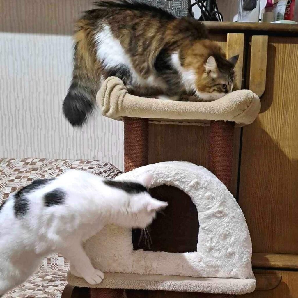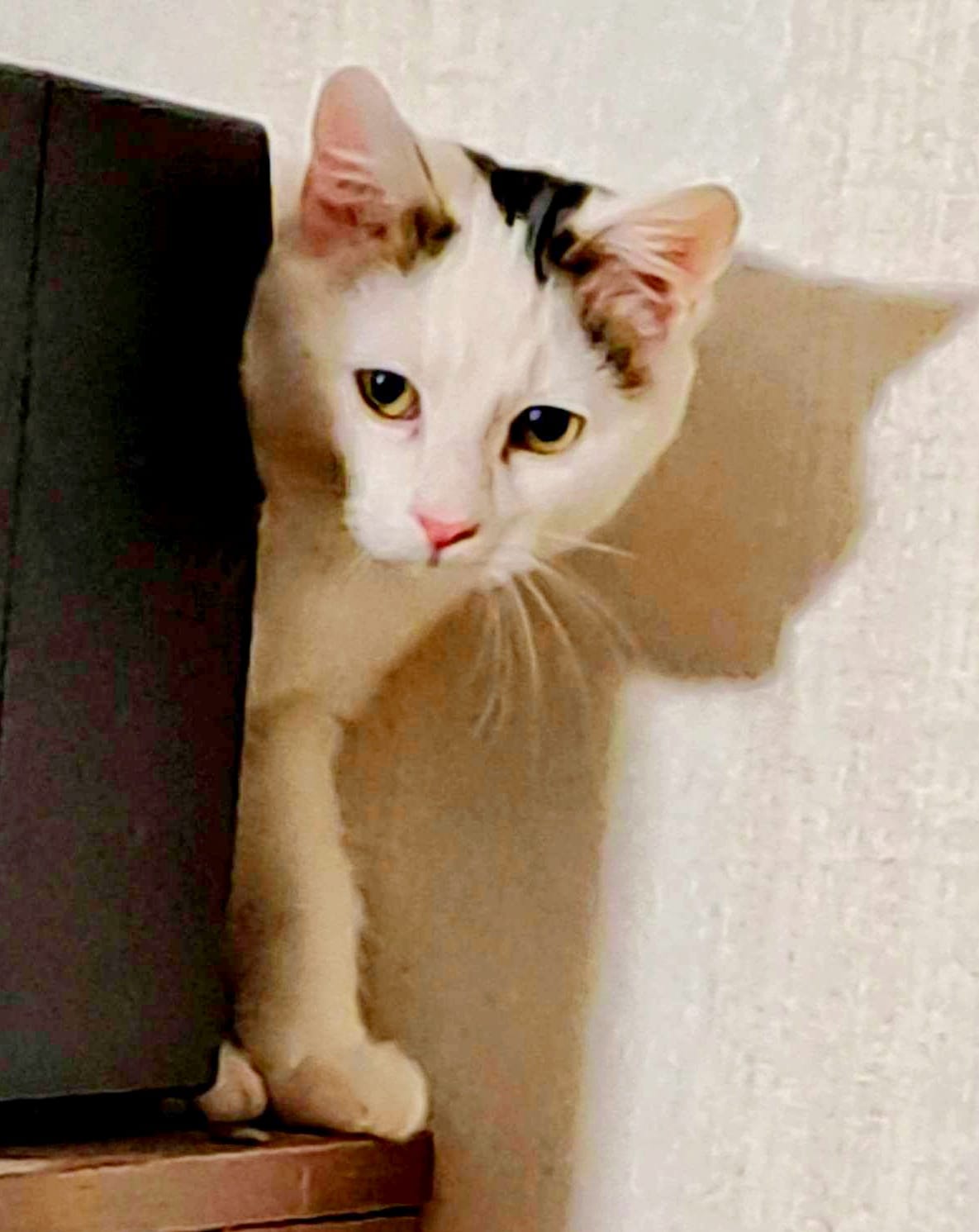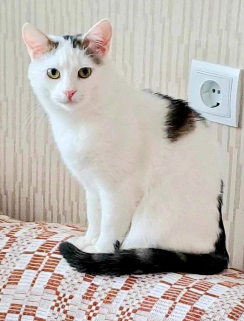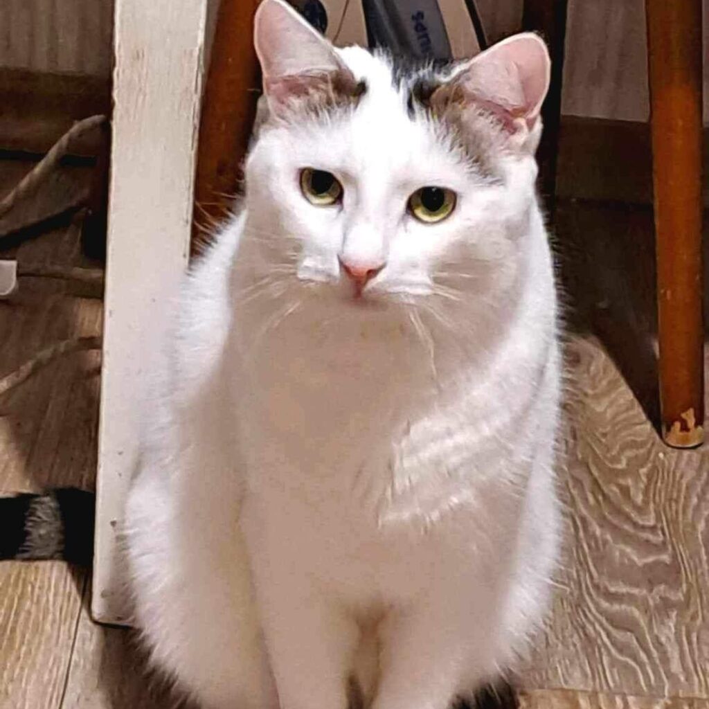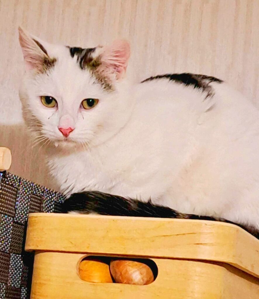 Duke (white with a dark “hat”) is a real aristoCAT – he prefers human leave him alone or engage just through food. We think that in the home environment where there are less cats, he can better build bonds with human and possibly becomes a friendly cat.