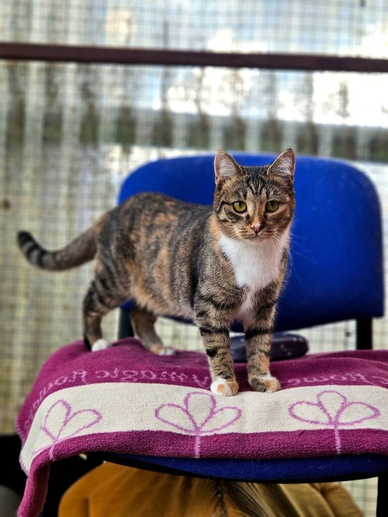 This is Irisa 🐈⬛ – a perfectly round, plush girl with thick, soft fur. She is beautifully built and looks like a masterfully painted tabby with a touch of calico “confetti” mixed in.