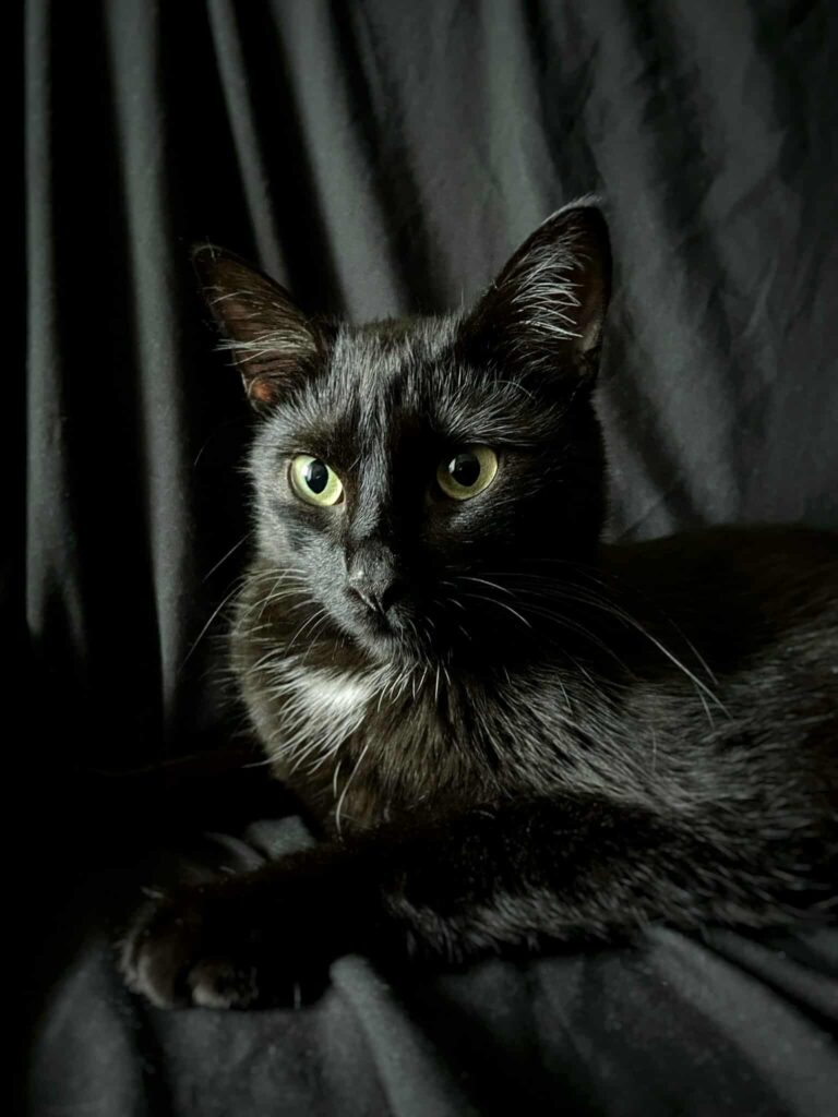Karma is a sleek, 1-year-old black cat who’s equal parts curious explorer and playful troublemaker. She’ll chase anything that moves, investigate every box you bring home, and probably steal your seat the second you stand up.