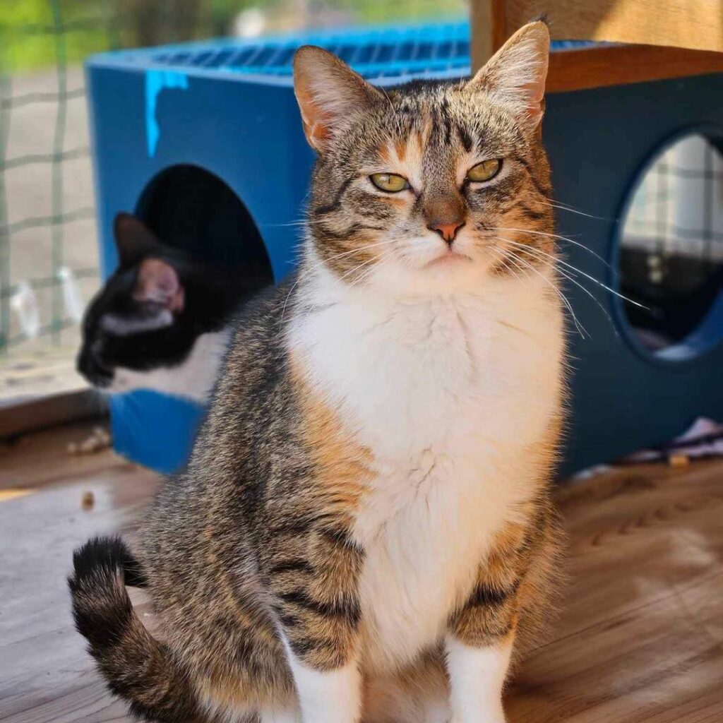 This kitty has not yet shown her true personality as she is a little stressed in the shelter conditions – so many cats and so little space. She is shy but curious, calm and gentle, food motivated. She doesn’t want to be petted yet and will take her time when meeting new people.