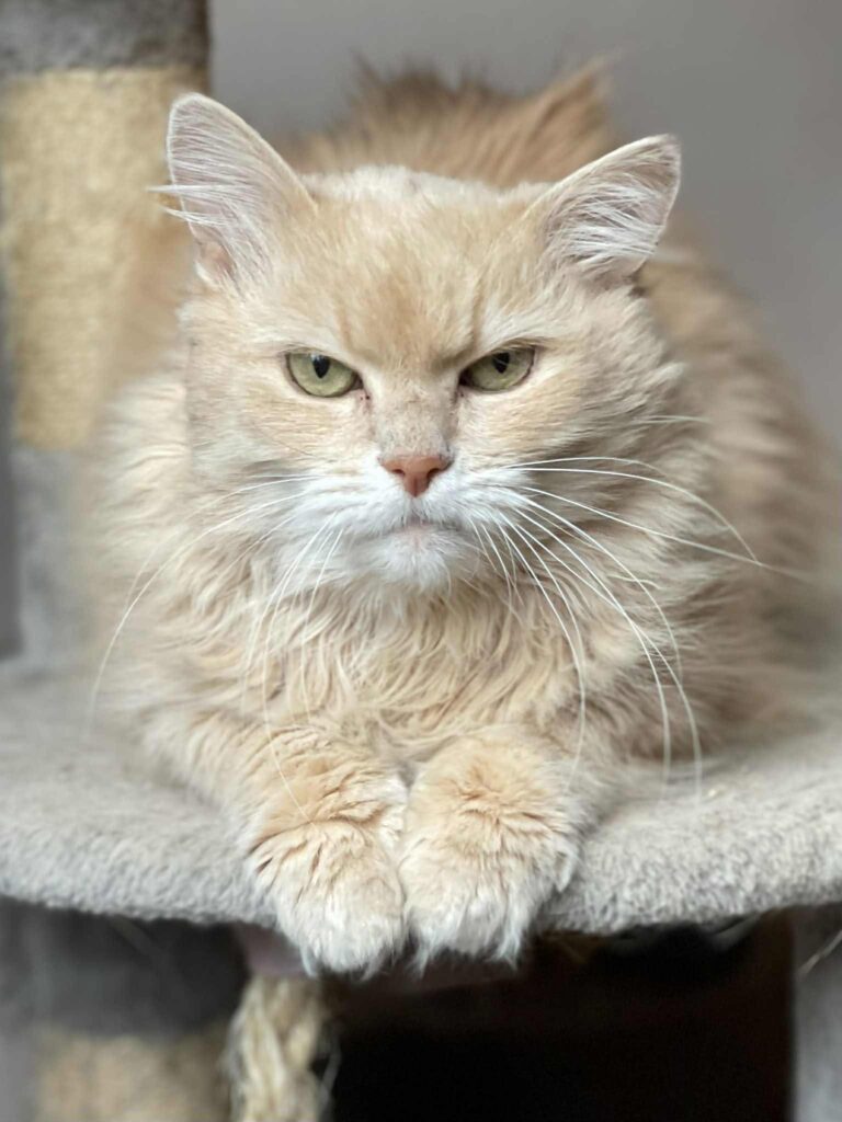 Smelte ended up at the shelter after he elderly owners passed away. She’s sad and stressed because, after living in her own home, she now she needs to share a small space with lots of other cats.