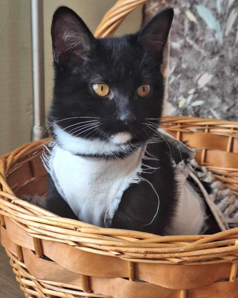Meet Tisa, the little fashionista with a sleek black coat, white vest, and adorable white mittens!