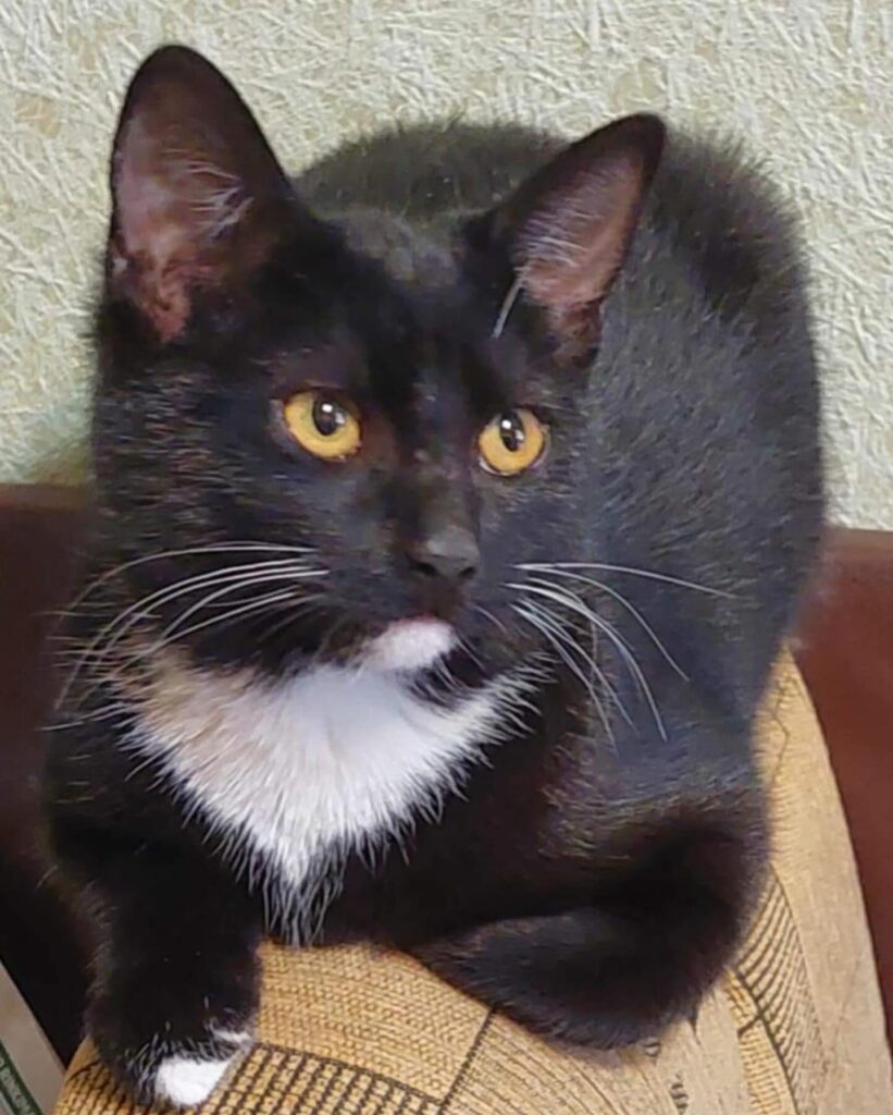 Meet Tisa, the little fashionista with a sleek black coat, white vest, and adorable white mittens!