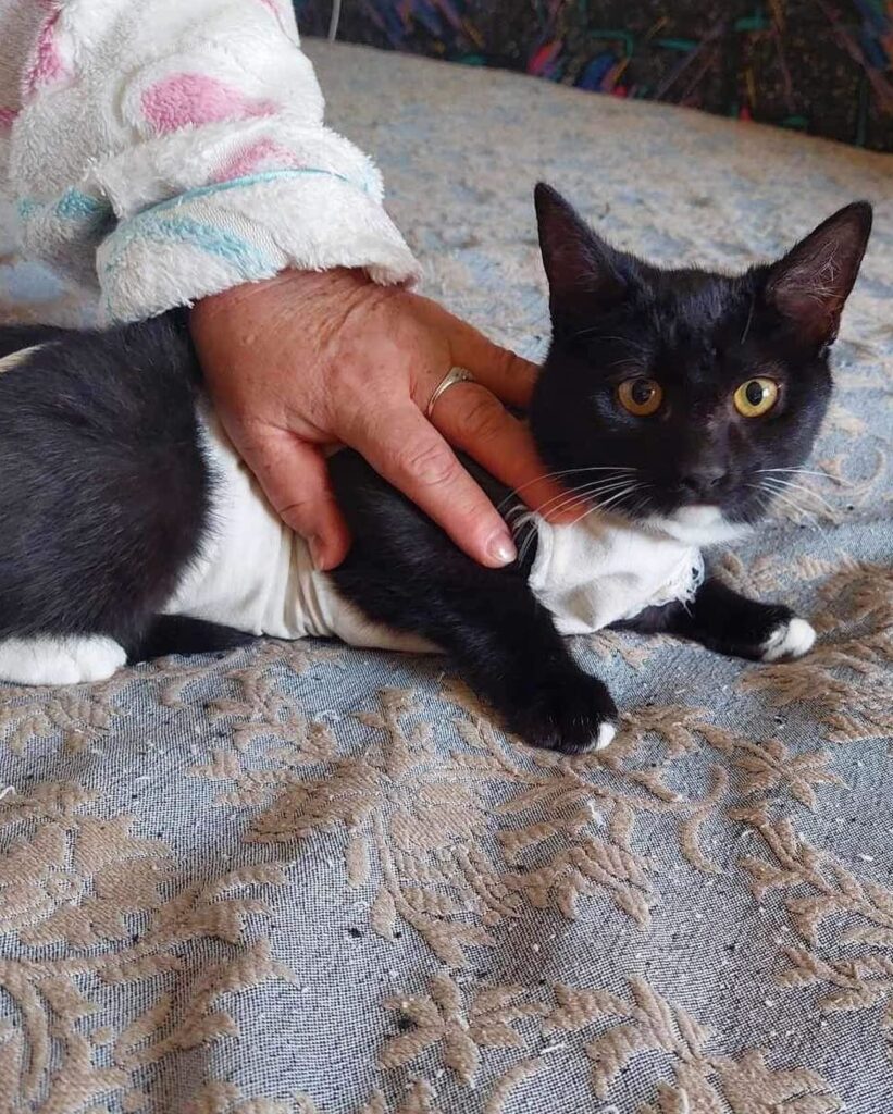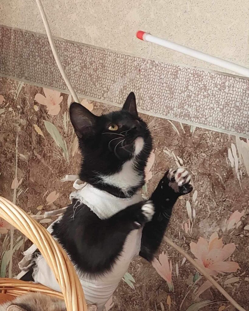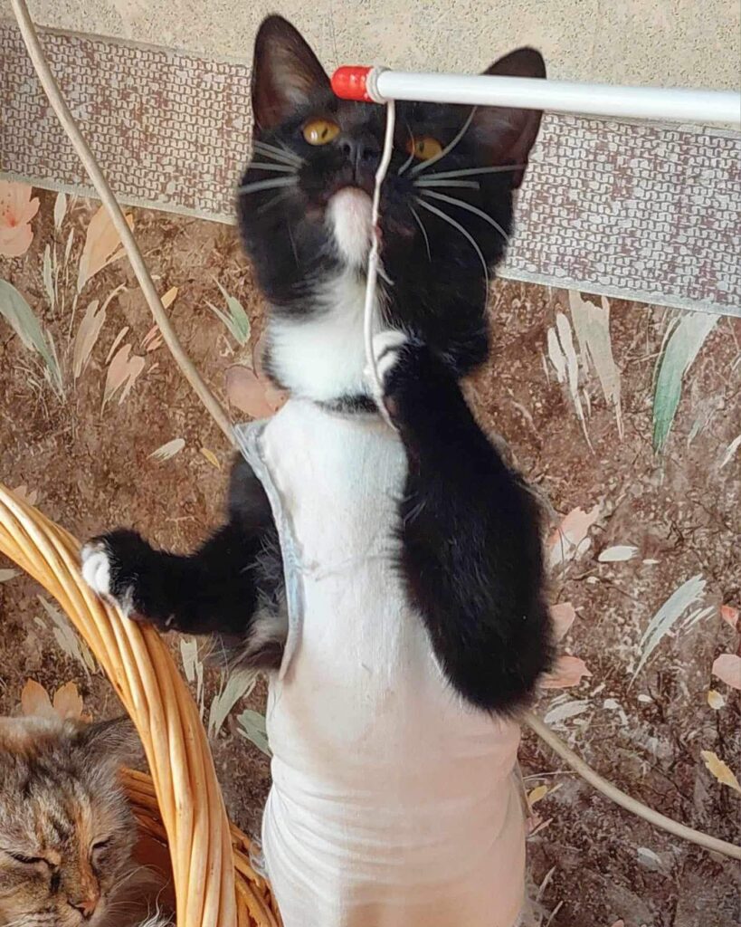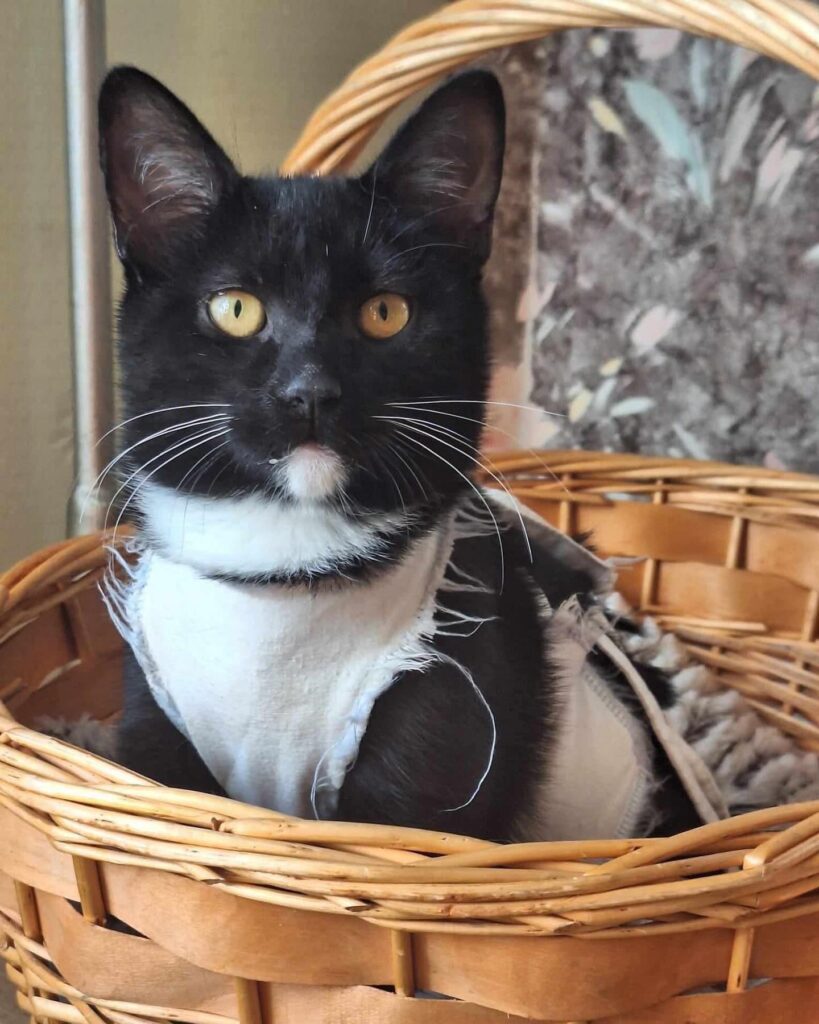 Tisa is the last of her feral mom’s four kittens that is still looking for a home, and while she’s a bit shy, she’s always ready to attack a feather toy or confidently show off her fashionable outfit (like she did after neutering surgery). She’s sweet and good-natured, and with a bit of time, she’s sure to bring warmth and cuddles to any home.