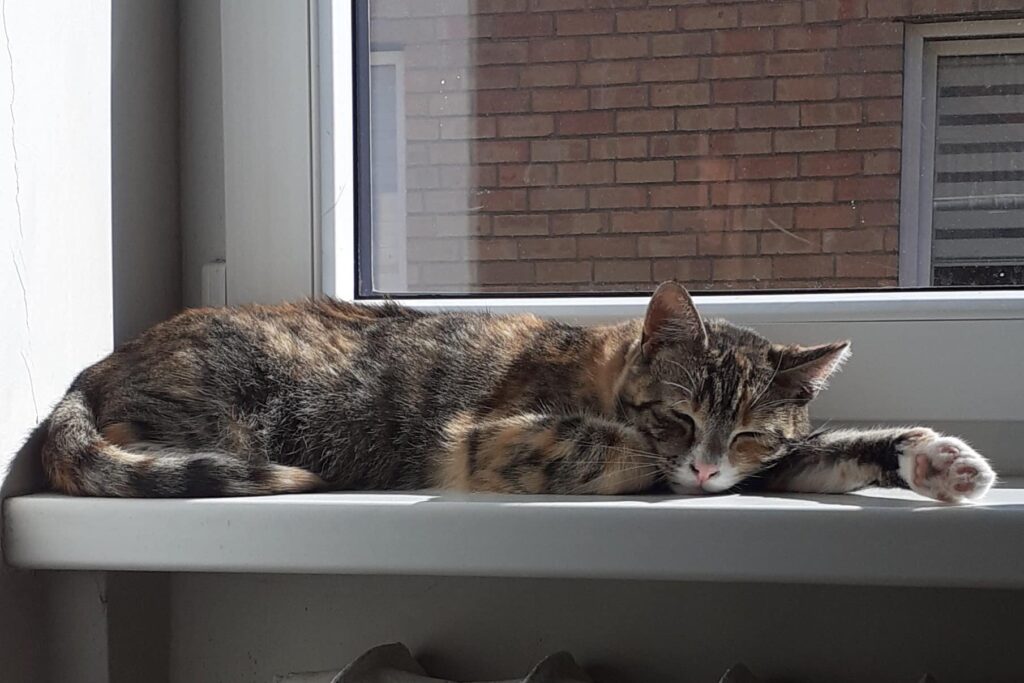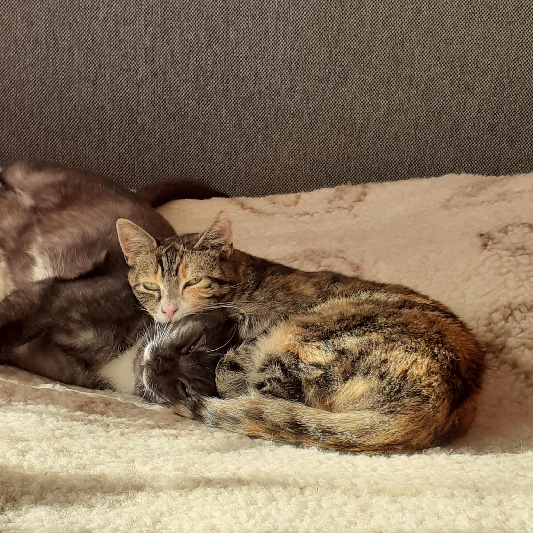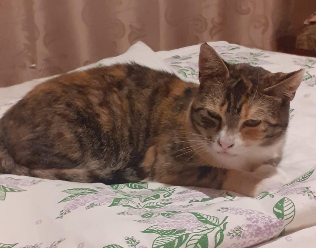Vyna (~5 years old) is a quiet, sensitive cat who’s beginning to open up to the world in her own time. She’s recently started joining her cat friends at mealtime, and she’s comfortable being near people, even sitting or lying down nearby. Though still cautious, Vyna is learning to trust and shows interest in gentle company.